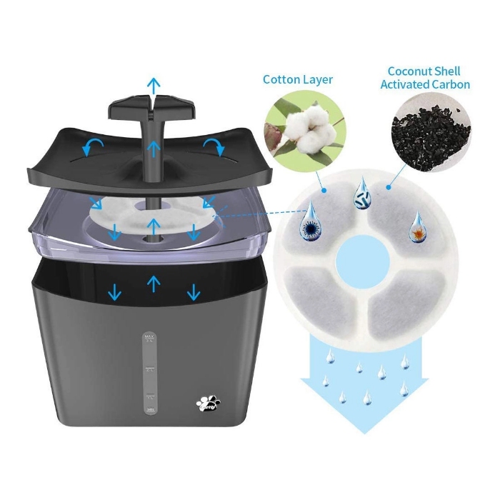The top tray is designed to hold a certain amount of water. Even in the event of a power outage, pets will still have sufficient emergency drinking water.